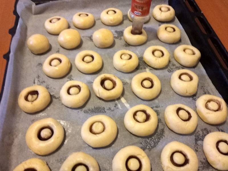 - Egy tepsi aljára sütőpapírt helyezünk. A tésztából diónyi gombócokat formázunk, és egymástól 3-4 cm távolságra a tepsibe tesszük őket.