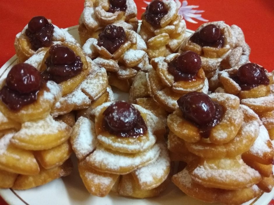 - A kész fánkrózsákat süssük ki forró, bő olajban, úgy hogy először a legkisebb lap kerüljön az olajban alulra. Majd megfordítjuk és megsütjük a másik felét is.