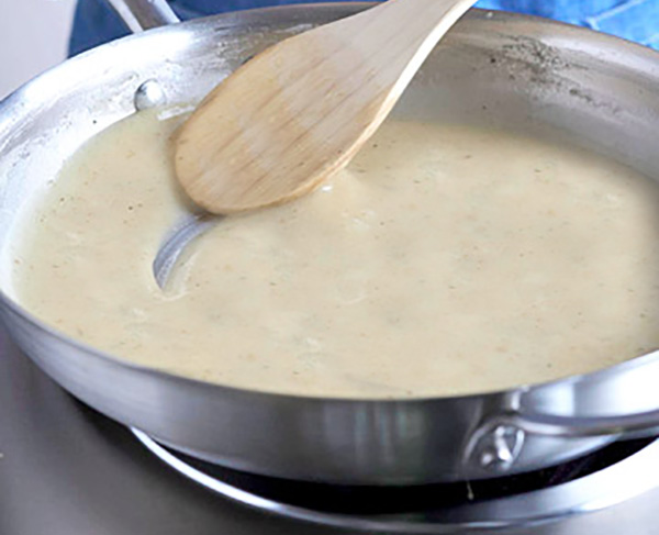 - A kókuszolajból és a lisztből világos rántást készítünk, a rántást a tejjel felengedjük, és forralással besűrítjük, így egy finom kis besamelmártást kapunk.