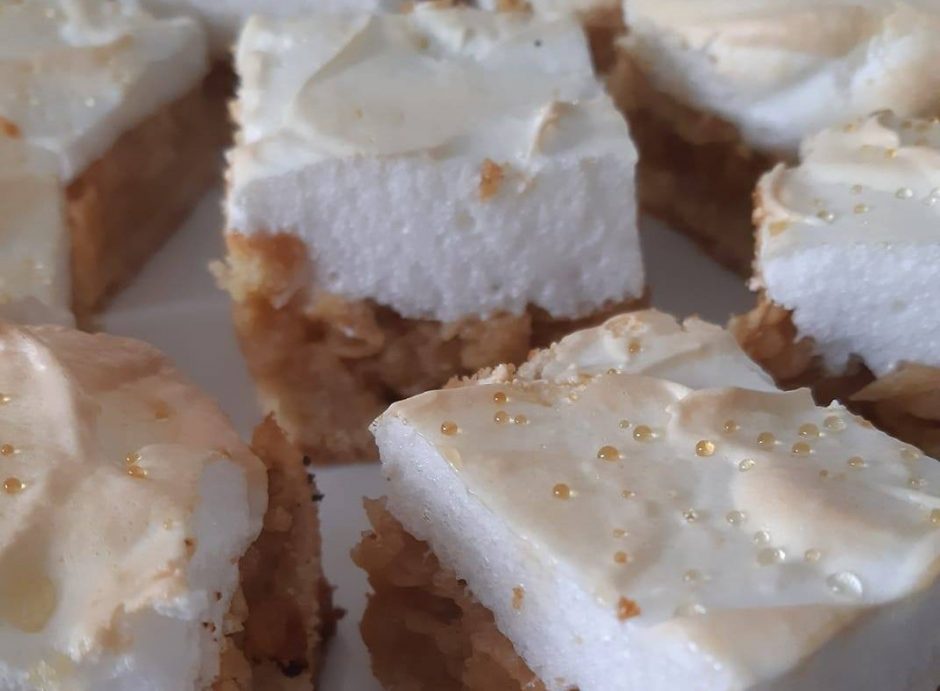 - Addig 4 tojásfehérjéből a 10 dkg cukorral kemény habot verünk és rásimítjuk a tésztára, majd 10 percig még tovább sütjük vele.