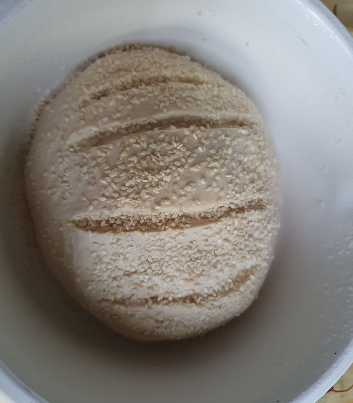 - Amikor kész, 40 percet letakarva pihentetjük. Ha kipihente magát megformázzuk, kibéleljünk az edényt szilikonos sütőpapírral, és beletesszük a kenyértésztát, Lehetőleg olyan sütőedényt használjunk aminek van teteje, mert abban sokkal könnyebb sütni. Ehhez én egy régi fehér jénait használok, aminek van teteje, de tepsiben is megsüthető. Amikor megformáztuk a tetejét bevágjuk, lespricceljük vízzel, és megszórhatjuk bármilyen maggal. Ezen a kenyéren szezámmagot használtam, de bármi jó ami nem pörkölt.