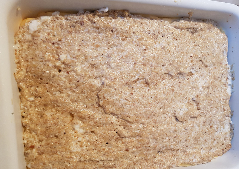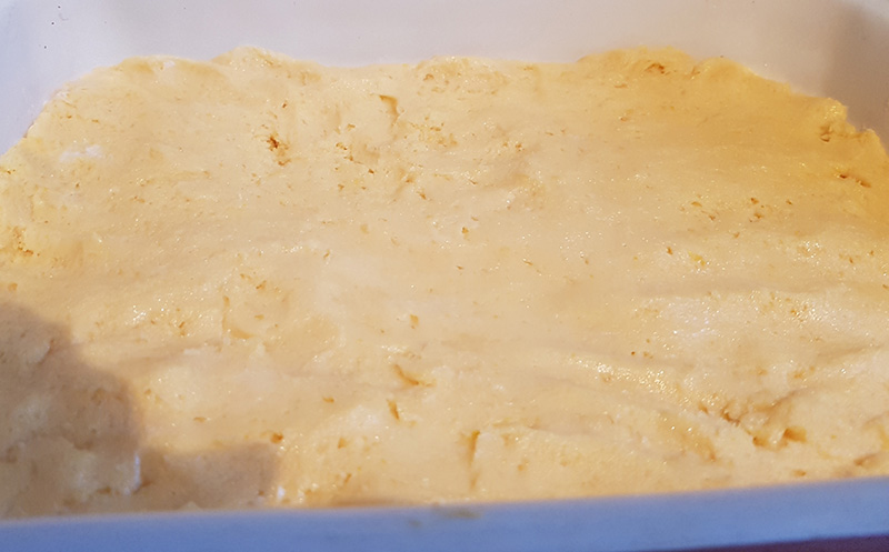 - A tésztát vajjal kikent, lisztezett tepsibe öntjük. Egyenletesen, enyhén vizes kézzel elsimítjuk a tepsiben.