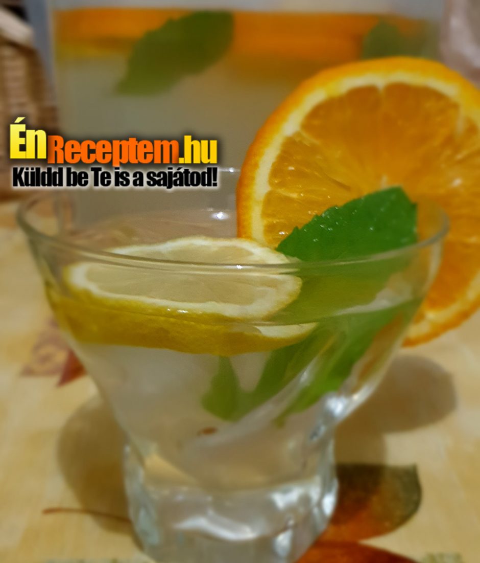 A kancsóban csak a narancs és a menta látható, mert a lime és a citrom lehúzódott az aljára.