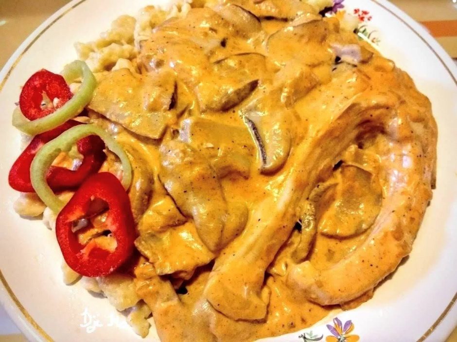 - A hagymát apróra vágjuk és az olajban halványra pirítjuk, beletesszük a gombát, meghintjük pirospaprikával, és egy kevés vizet öntve alá, puhára pároljuk ( vargányánál kb. 25 perc).