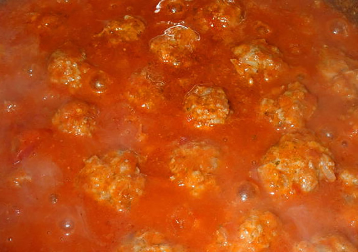 - Vizes kézzel 4-5 cm-es gombócokat formázunk. A gombócokat óvatosan a paradicsommártásba tesszük. 45 percig lassan, kis lángon főzzük, az elpárolgott folyadékot vízzel vagy alaplével pótoljuk. Ha a gombócok elkészültek főtt tésztával tálaljuk. Legjobb a spagetti vagy a bucatini de elkészíthető bármilyen tésztával.