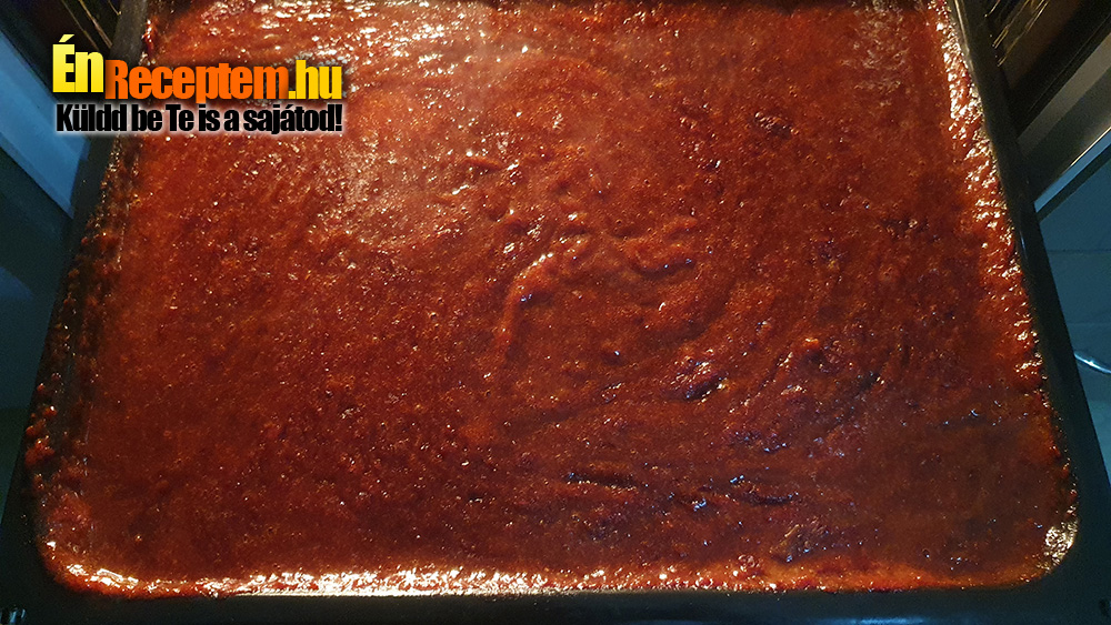- 200°-on felforrásig, azt követően 140°-on 3-4 órán keresztül sütjük, úgy, hogy fél óránként megkeverjük, vigyázzunk rá, hogy le ne süljön. Láthatjuk, hogy nagyon szép a színe, és sok nedvesség elpárolgott belőle a sütés közben.